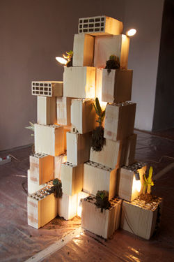 the presence of slum risen in spontaneous way and with material of recovery, around border districts of the contemporary metropolises.sperienza di prossimita' (Experience of proximity) is a reflection on the concept of urban proximity. The contemporary cities are beehives in continuous expansion. Buildings and skyscrapers overlap, allowing million of people to crowd every available space. The vital space becomes a shared space in which the law of proximity' it governs the human relationships. In the installation different material - terracotta bricks, aluminum, cactus and bright light bulbs- are assembled in such way to remember the constant of all urban space: